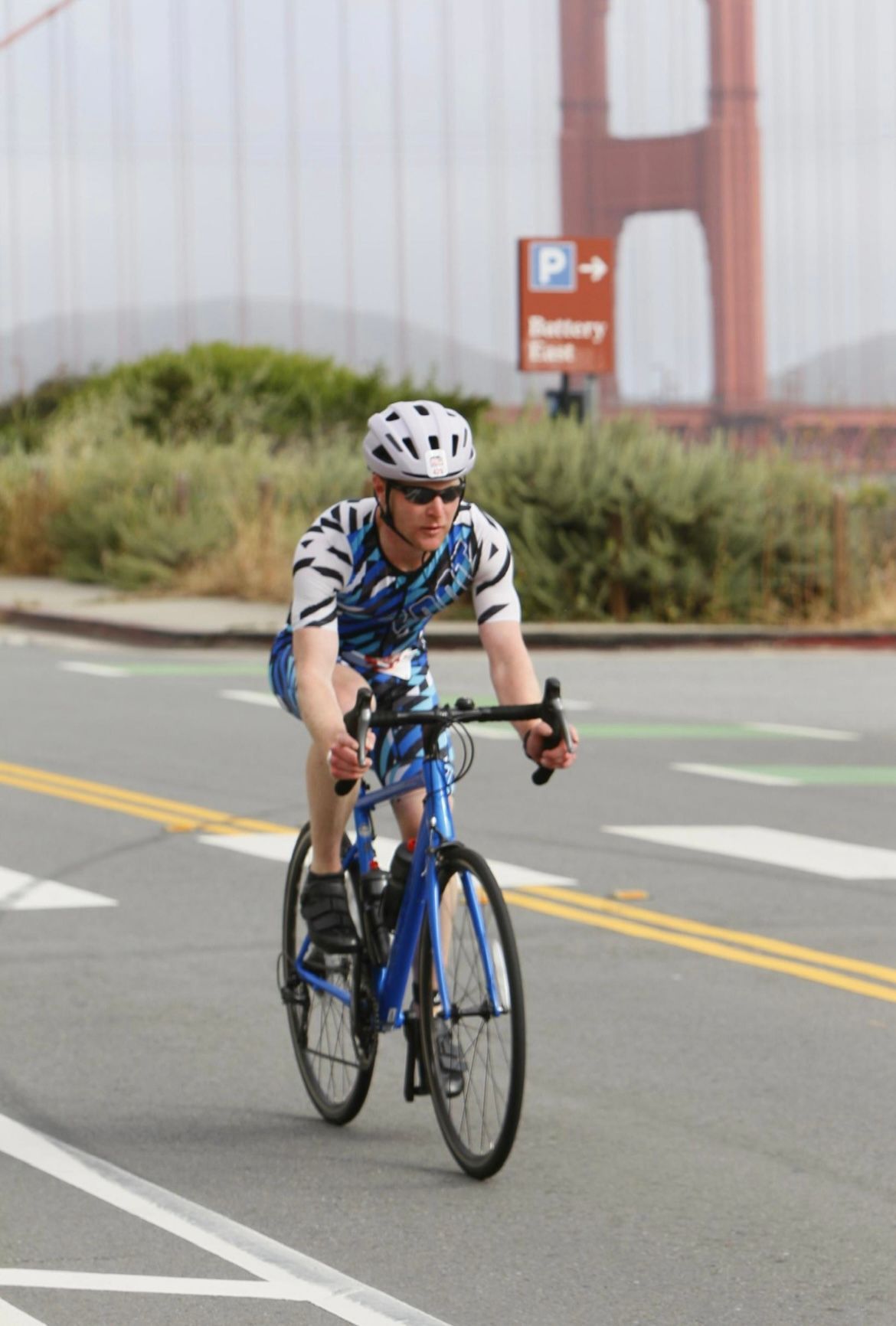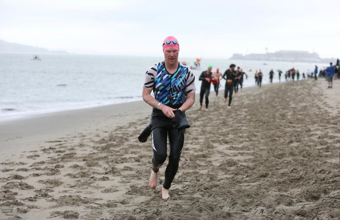 Once the athletes begin to jump, they exit the water pretty quickly. On average, Mitch would complete a 1.5 mile lake swim in approximately 40 minutes, however he swam this in 21 minutes and 53 seconds. It’s easiest to watch from Marina Green beach on the Golden Gate side of the St. Francis Yacht Club. Once the swimmers exit, they will go through a mini transition area as there is a half mile run to transition. We saw our athletes through the mini transition area and then did not see them again until they came back in from the bike.