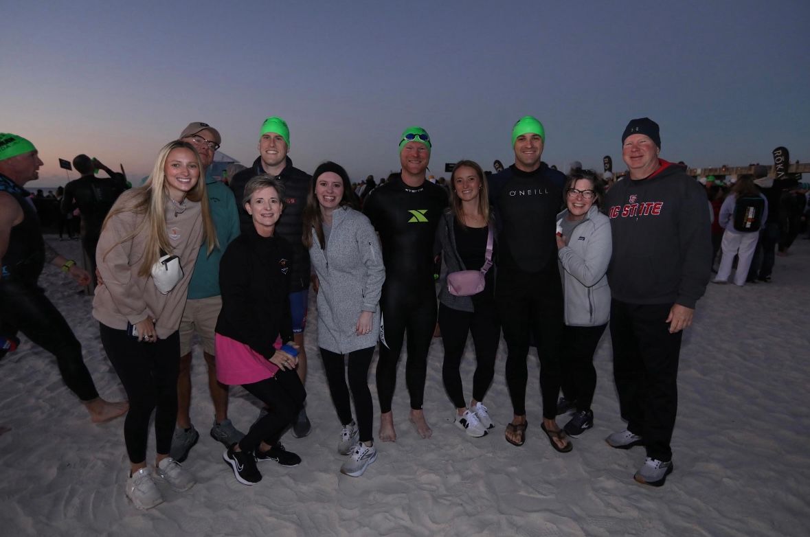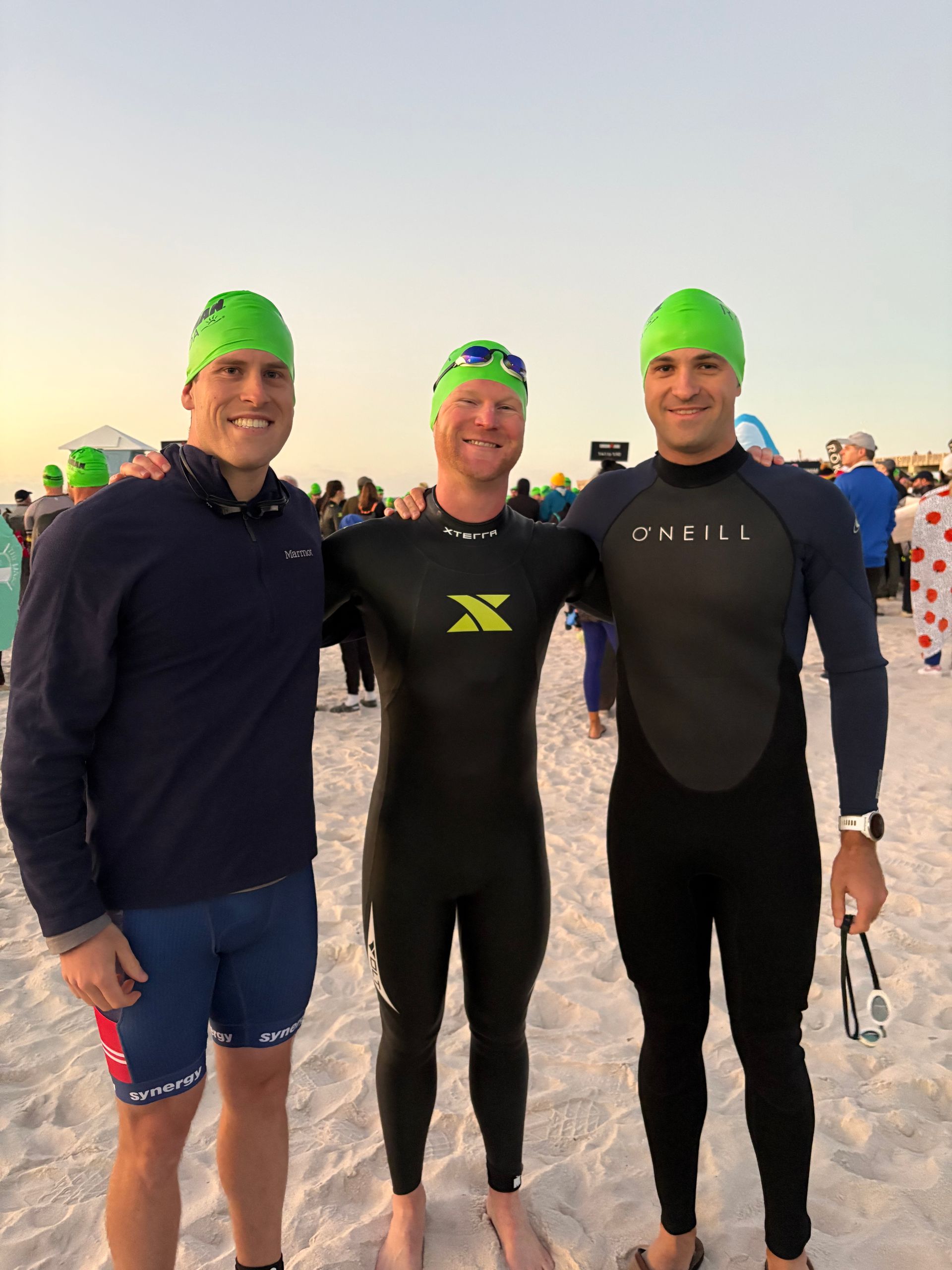 Race day always starts early, however, since most of our gear was already packed, the only real responsibility of the morning was to pump up tires and add nutrition to the bikes. After that, we “stretched in the heat of the hotel” and worked our way to the beach 30-45 minutes before the race. Standing on the beach with the support crew was cold, but the time went by fast. Before we knew it, we were lining up to jump in the water.